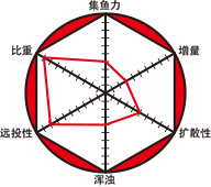 混合了会产生高效黑鲷喜好的数种浑浊类型的钓饵。钓饵入水同时会产生浓烈白色的浑浊在水面扩散,可以确认到潮汐的流向。此外,比重不同的浑浊分散下沉,消除了鱼儿的警戒。配合了黑鲷喜爱的玉米和小麦等颗粒,可以让黑鲷长时间持续食饵。